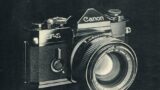 黒いボディを強調する暗い背景のライティングは、精密機器としての存在感を際立たせています。軍艦部には液晶表示が配置され、操作も電子制御を前提とした構成になっています。1980年代は、一眼レフが精密な機械装置から電子制御カメラへと変化していく時代でした。